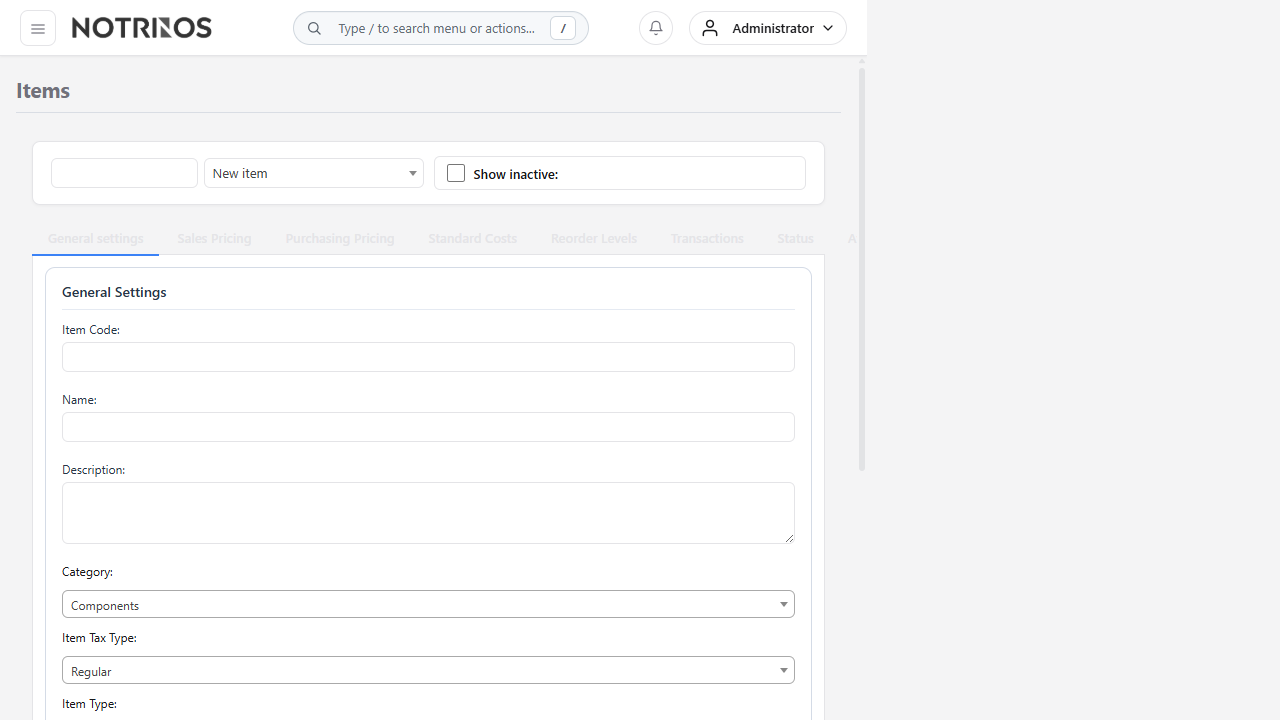 Create and maintain inventory items. Items can be physical stock, services, or fixed assets.